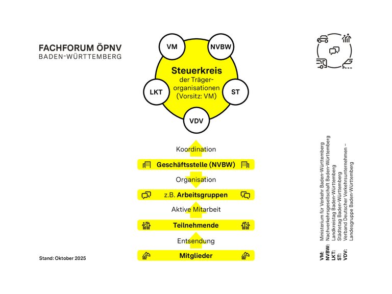 Die Trägerorganisationen haben in einer gemeinsamen Rahmenvereinbarung die Zielsetzung, die Zusammenarbeit, die Struktur, die Wirkungsweise und die Modalitäten der Mitgliederaufnahme in das Fachforum ÖPNV festgelegt.